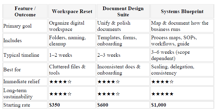 If you want steady support after a project—monthly docs, quarterly cleanup, ongoing systems help, and light HR support (job postings, interview questions, onboarding checklists) → choose a Retainer.